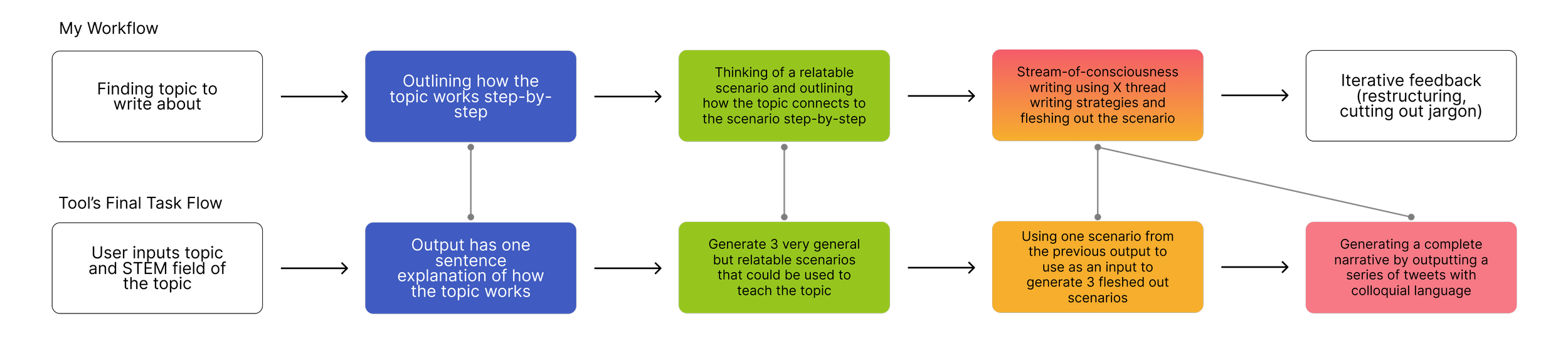How would we design the tool’s task flow to closely represent how a writer would create scientific explanations in the form of Twitter/X threads?
